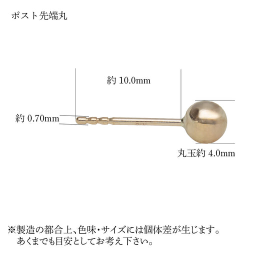材質:K10YG ※10金イエロー系 目安寸法:丸玉サイズ:4.0mm スマートポスト3本溝 0.7/10mm 刻印:K10 ※製造の都合上、サイズと色味には若干の個体差が出る場合がございます。あくまでも目安としてお考えください。 ※こちらはペア売りの商品です。