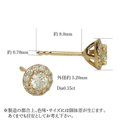 材質:K18YG ※18金イエロー系 目安寸法: Dia0.15ct:3.4mm Dia0.30ct:4.5mm スマートポスト2本溝 0.7/8mm 刻印:K18 ※製造の都合上、サイズと色味には若干の個体差が出る場合がございます。あくまでも目安としてお考えください。 ※こちらはペア売りの商...